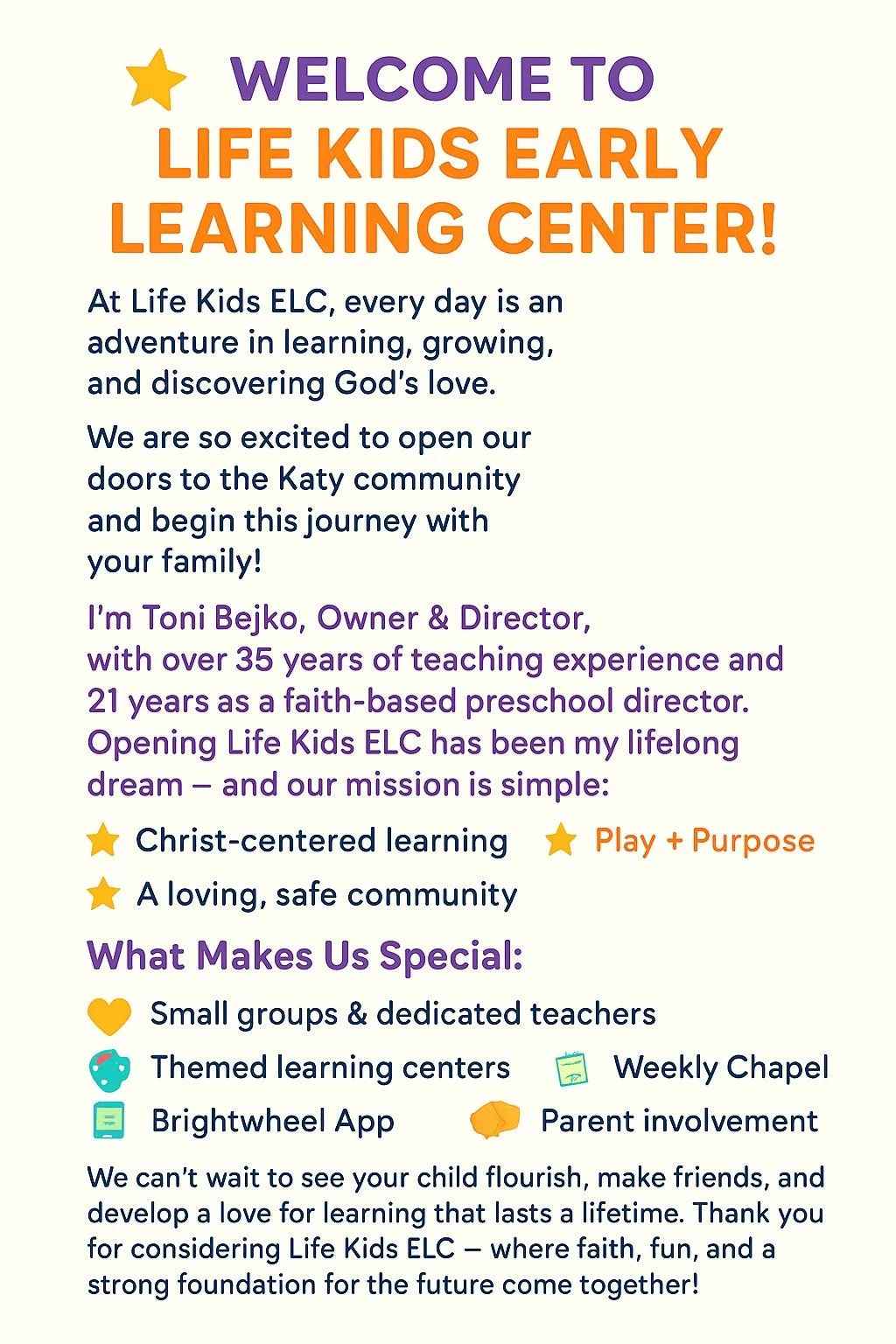 Life Kids Early Learning Center is now open! A Christ-centered, affordable mother’s day out preschool for ages 2-5, Tuesdays and Thursdays, 9:00am-2:30pm. Click contact to schedule your tour today.